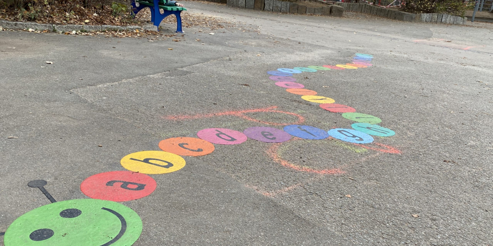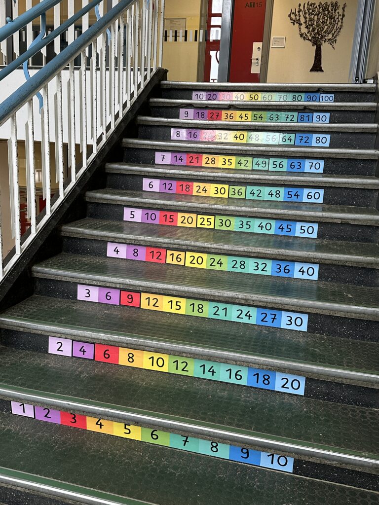 Seit ein paar Wochen verschönern bunte Zahlen das Treppenhaus. Wer die Treppe hinaufgeht, sieht „Verliebte Zahlen“ und Einmaleinsreihen.